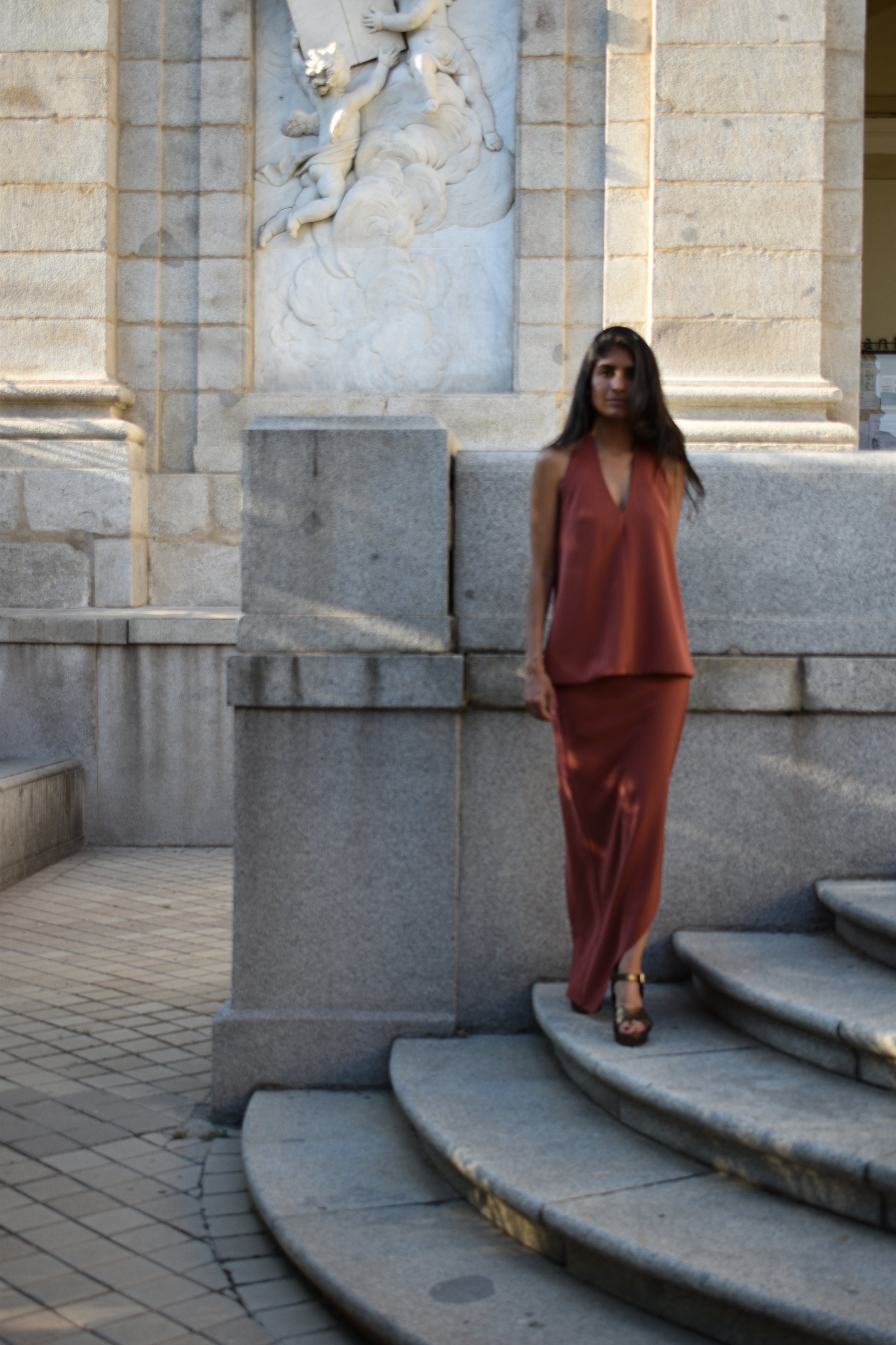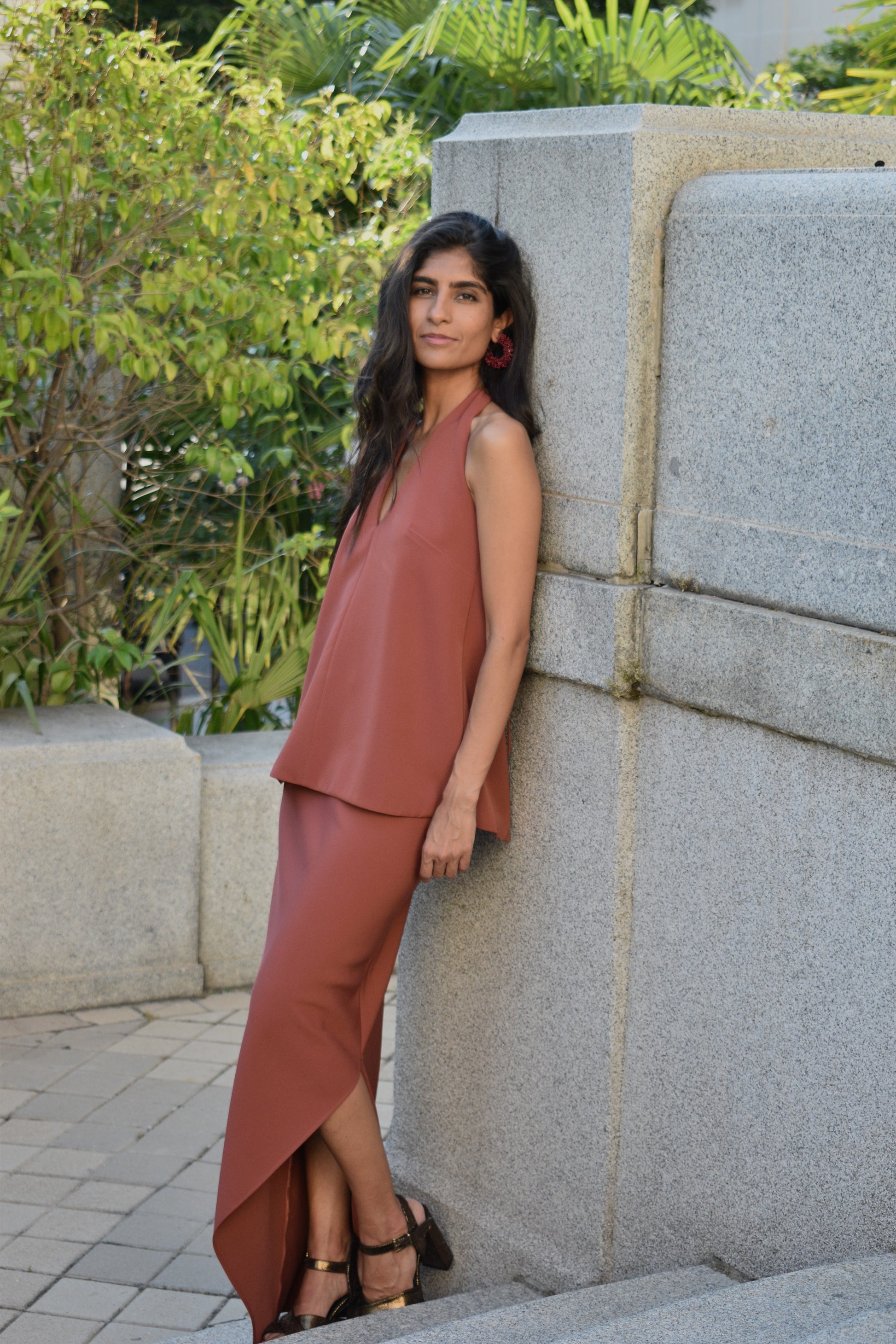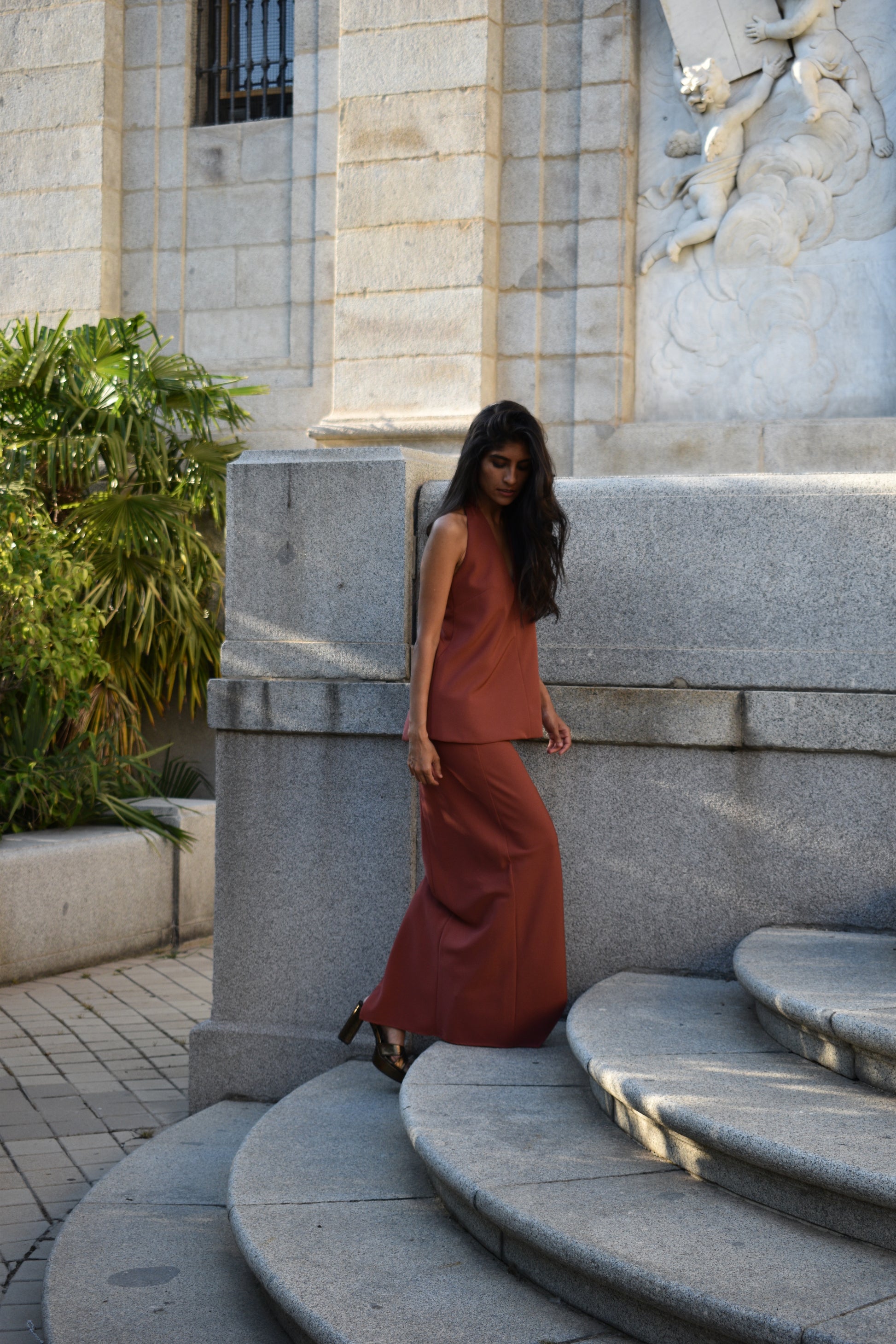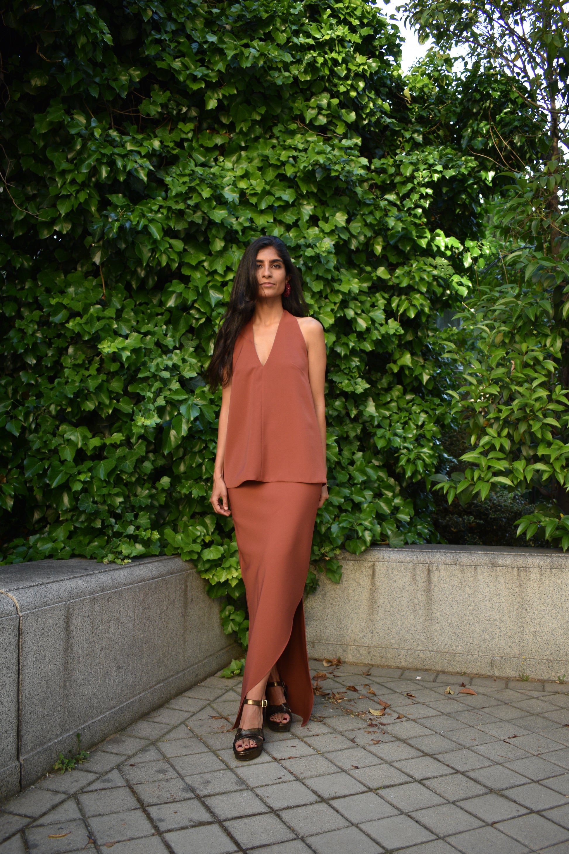Conjunto dos piezas compuesto por un top de cuello tipo halter y falda con abertura lateral en un elegante tono caldera. El top se ata a la espalda con un nudo o lazo, mientras que la falda incorpora una cremallera trasera. Es un look perfecto tanto para ocasiones especiales como para combinar por separado y conseguir un look más relajado.