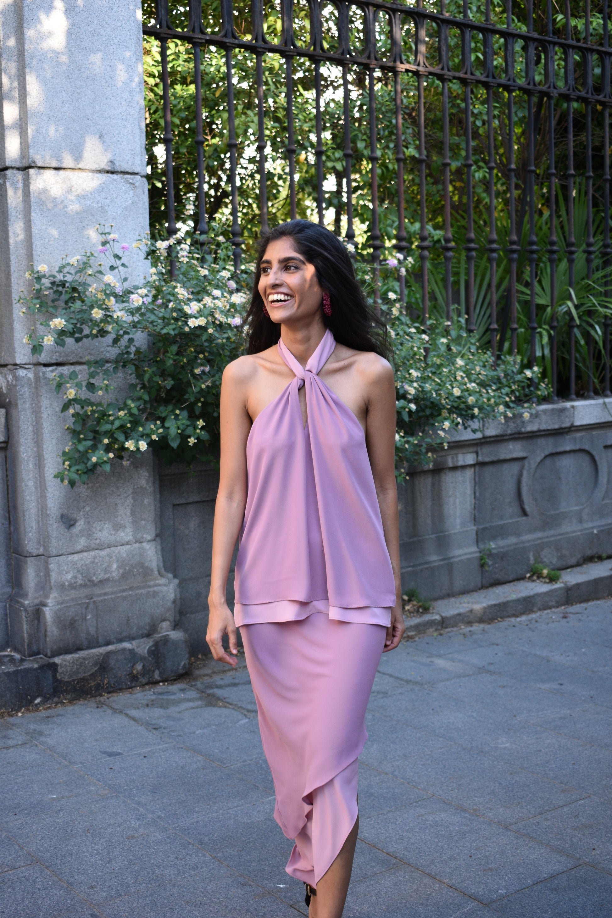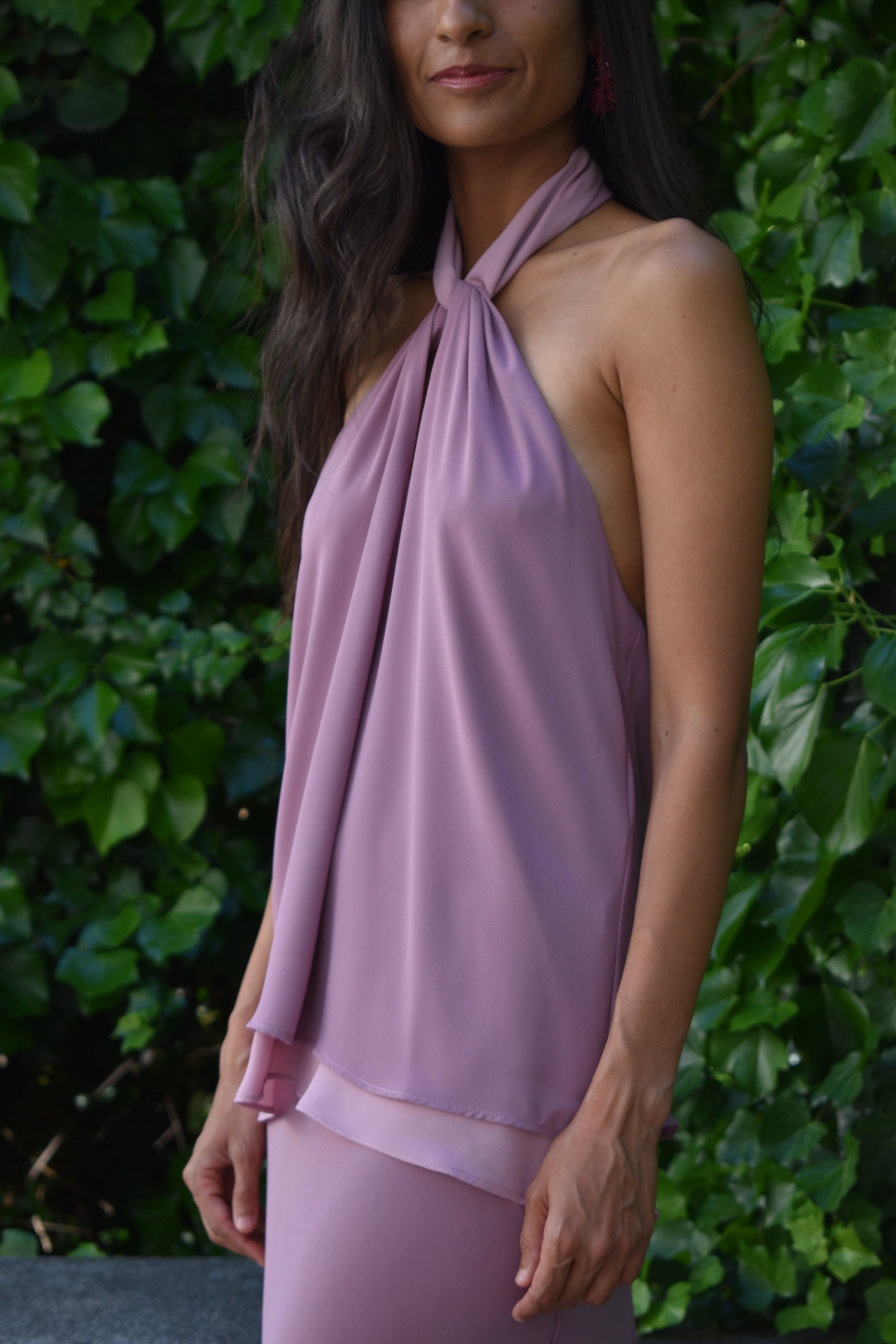 Conjunto compuesto por un top de cuello tipo halter y una falda asimétrica. Confeccionado en gasa, combina dos tonos muy favorecedores de malva.
